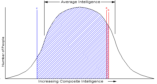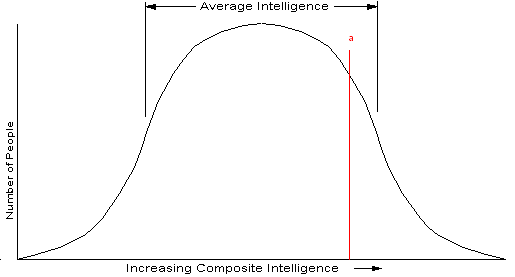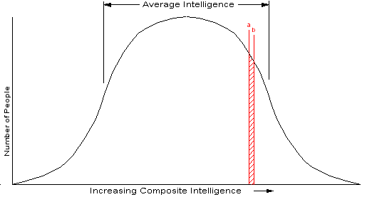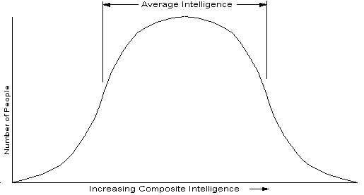 Not everyone could do this work. There was a certain minimum intellectual level required to do the job. If we could quantify the intelligence of people, not just the traditional IQ, but also such things as people skills, mechanical ability, word skills (verbal and written), music talent, education, motivation and self discipline- all the things we do over and above what a monkey does. If it was possible, we could measure the number of people verses their intelligence level, and as you might expect, get a frequency distribution as seen in Figure 1. Toward each end, we get fewer and fewer people, with most people somewhere in the center. People like Beethoven and Einstein would be on the extreme right, while those with sever learning disabilities on the left. Mind you, there really isn’t a Composite Intelligence measurement, we are just using this concept for illustration.